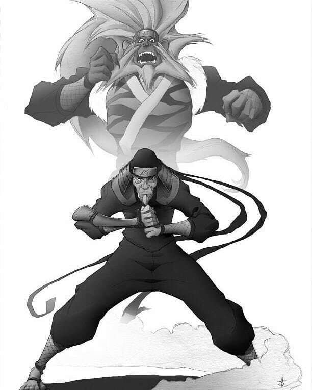 Ступив на поле боя, будущий Рокудайме Хокаге был с поднятым протектором его родной деревни шиноби - Конохугаре, в его левом глазу виднелся шаринган с 3-мя томоэ, что быстро слились в уникальный узор, а значит бы активировал Мангекё. Едино с действиями Жабьего Отшельника, Копирующий Ниндзя Конохи создал пару теневых клонов, 1 из клонов стоял в 2-ух метрах слева от Какаши, идентично появился и второй клон, но уже по правую руку от Какакши-Шарингана. По появлению клоны были так же с поднятыми протекторами, а в их левом глазу виднелся шаринган с 3-мя томоэ. Как только Ссанин был на половине своего прыжка, Какаши, используя Камуи, "отрезал" кисть Джираи. (Как в бою с Дейдарой). Появшись на поле боя, клоны также начали складывать ручные печати.