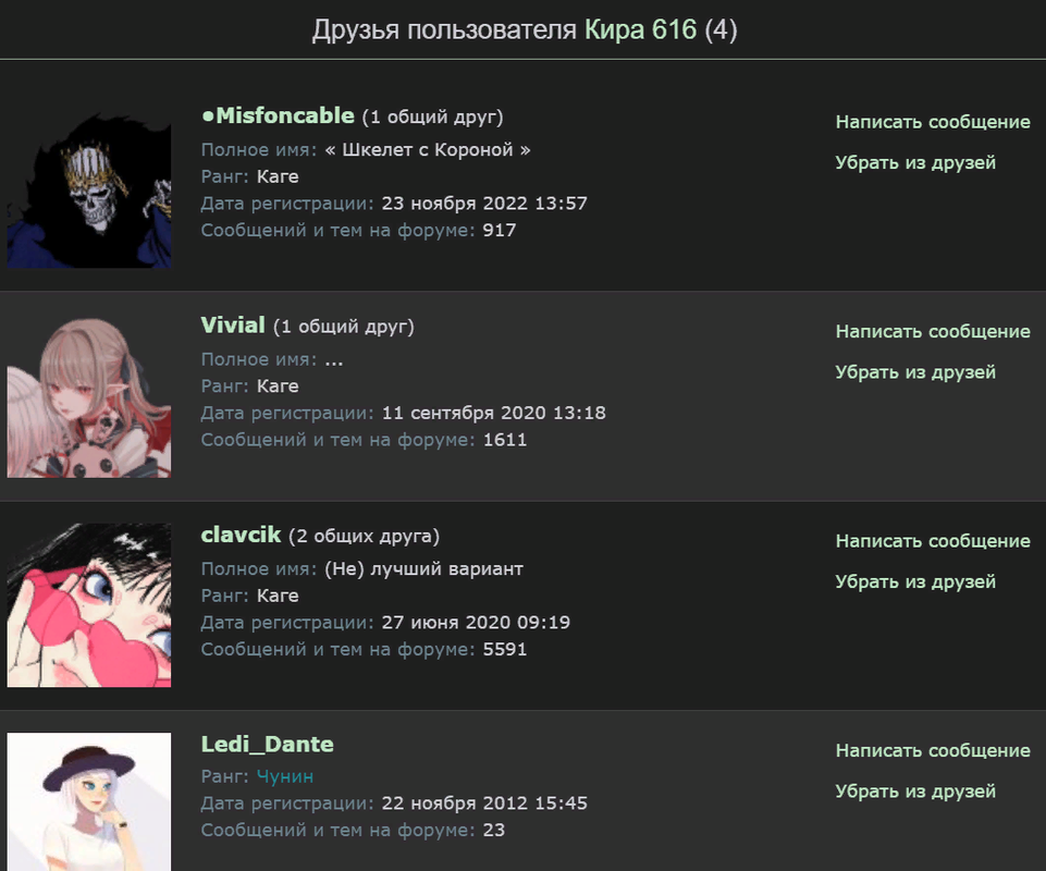 Маленький списочек 1. Это моя сестренка [бубофина] Далекие 13г, познакомился с ней, когда ей понадобилась помощь по создание персонажей, вот и после этого сдружились. 2. Моя бывшая тяночка [Tsynade] Шел 13г-14г, в чате заобщались и после перешли на тет на тет, также помогала мне когда становилась судьей, уж не помню, так как много раз она уходила и возвращалась. 3. Мой напарник [Ниндзя литста] Если не ошибаюсь в 15 г. на поединке часто встречались и заобщались, после вдвоем придумывали тактики 2х2, также создавали вдвоем персонажей, самое угарное было, когда вышла обнова по наградам мы начали их преследовать - находить подсказки.