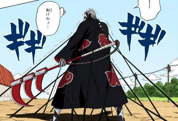 Единовременно с броском нингу противника, Яманака вновь совершает перекат, но уже в левую сторону на 1 метр. При произведение маневра всё также продолжал держать подобие ручной печати, направленной в сторону Нары. А по завершению переката, остался в позе полуприседа и в напряженном состоянии. Готовится.